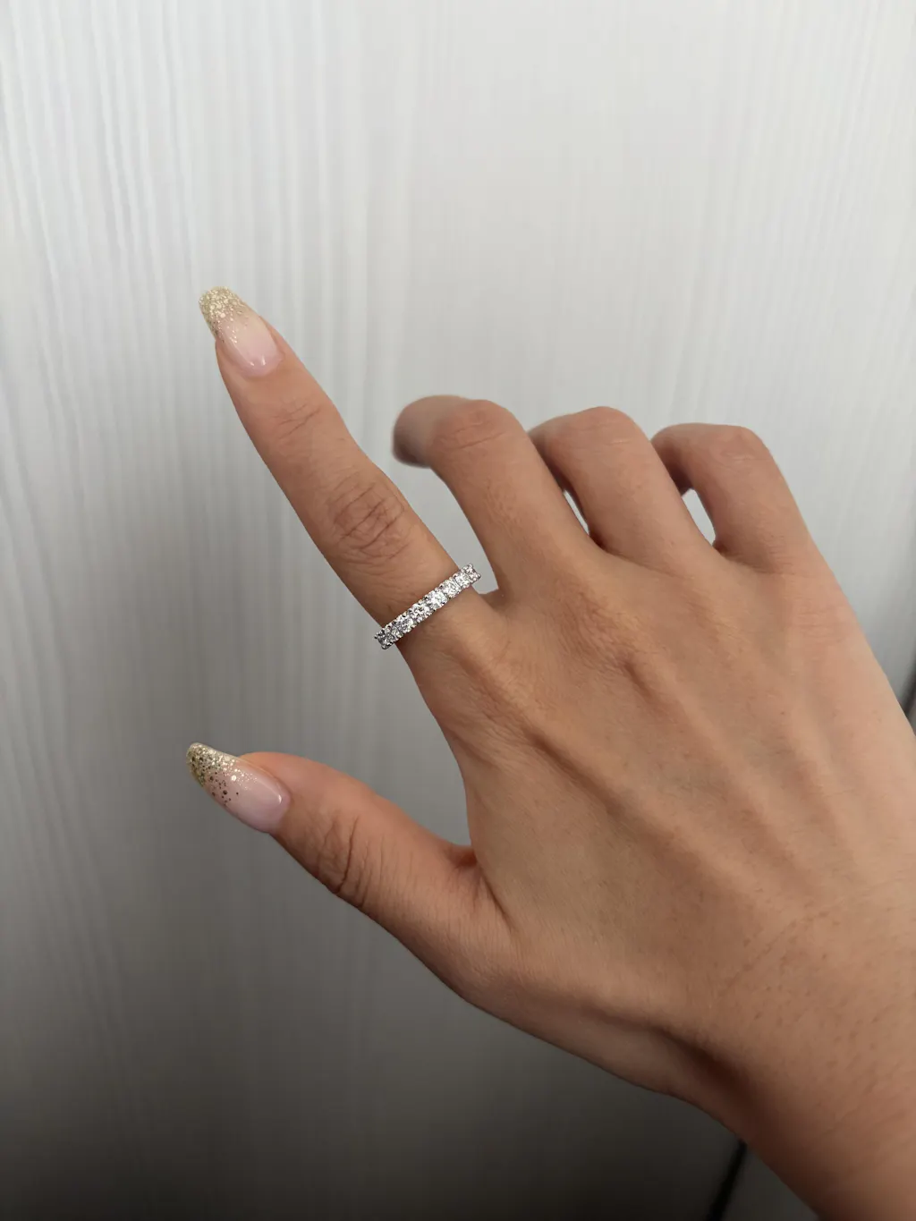 「マリアージュ」は、幅3.0mmの存在感あるエタニティリング。8ピースのダイヤモンドを4点留めのボックスセッティングで配し、2段腰で立体感を持たせています。フィルグランと比べると幅が広く、しっかりとした重厚感と華やかさを兼ね備えており、両者の間に明確な差別化が生まれています。